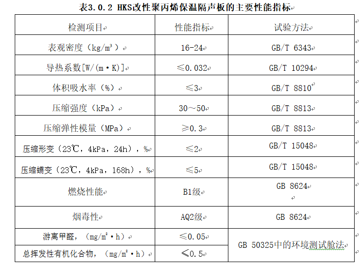 表觀密度16-24(kg/m3),導熱系數≤0.032[W/(m·K))],體積吸收率≤3%,壓縮強度30-50kPa,壓縮彈性模量≥0.3(MPa),縮形變在(23℃,4kPa)≤2,壓縮蠕變在(23℃,4kPa)≤5,燃燒性能B1級,煙毒性AQ2級,游離甲醛≤0.05(mg/㎡·h),總揮發性化合物≤0.5(mg/㎡·h)